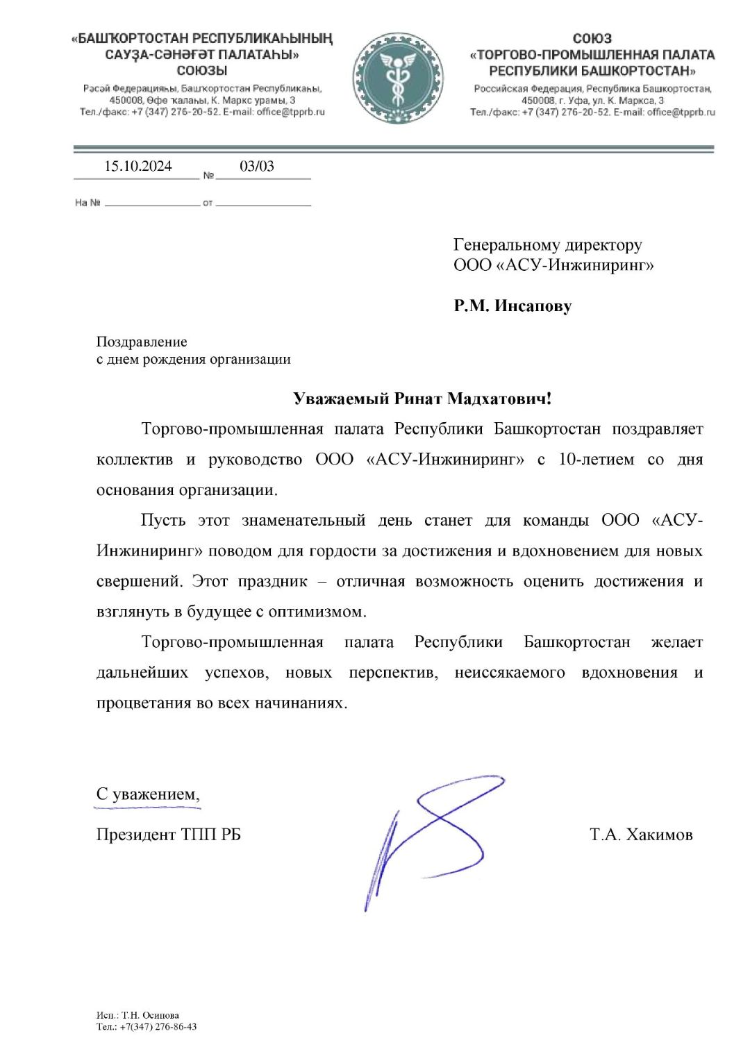 Поздравление Торгово-промышленной палаты РБ с 10-летием компании